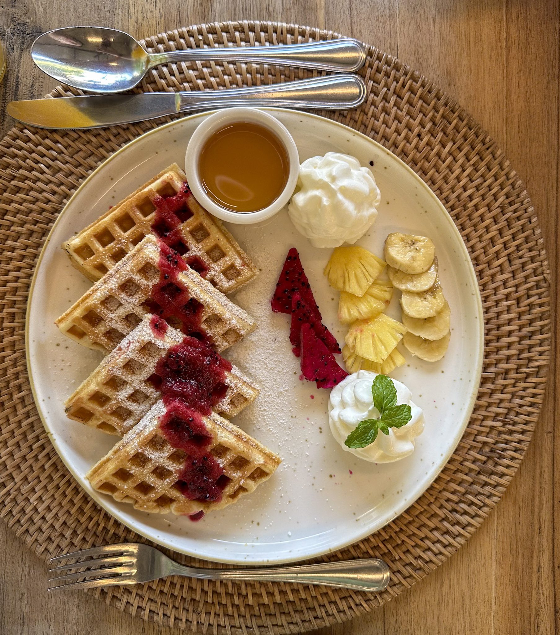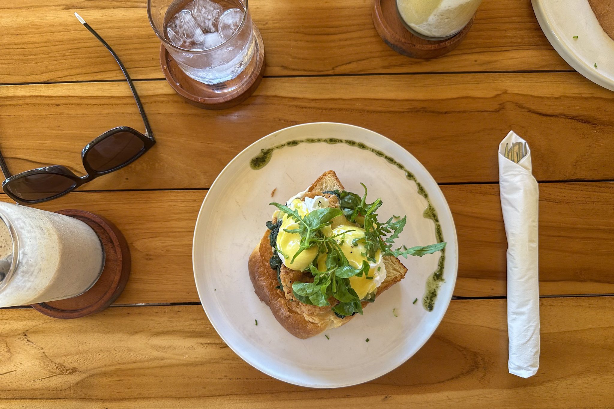 Déjeuner très gourmand, assez “occidental” (œufs bénédicte, bacon de bœuf, pain brioché). Très bon, même si certains éléments comme les frites semblaient industriels.