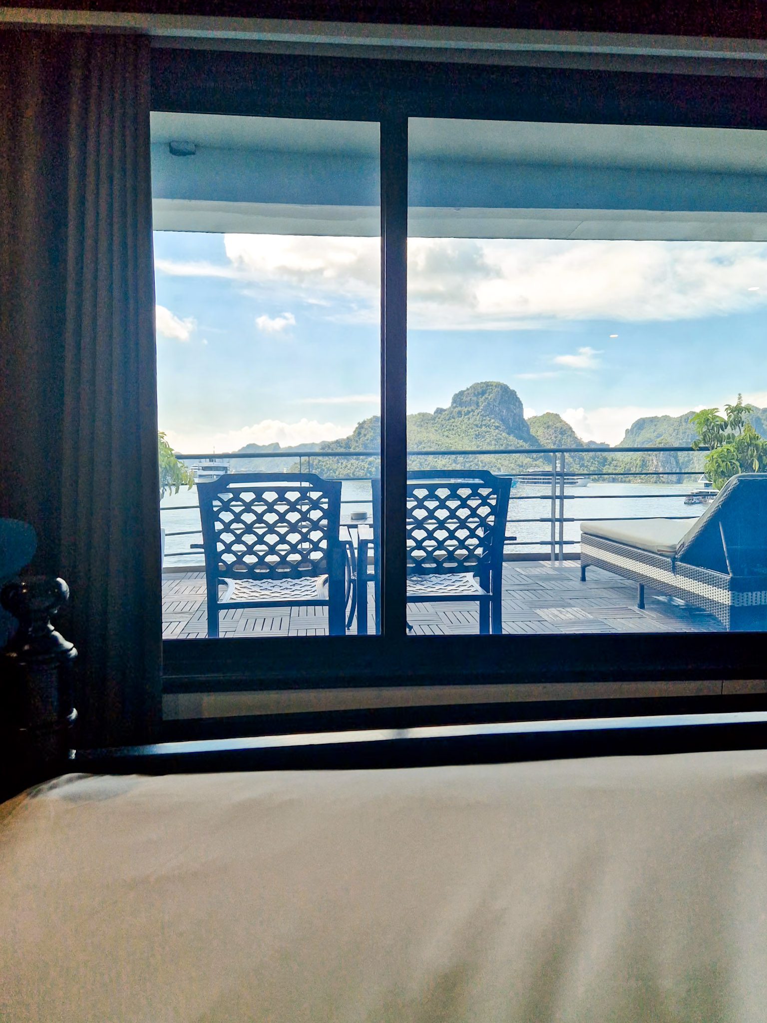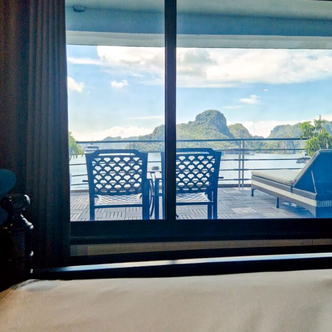 Nous avions réservé la plus belle suite du bateau Velar, et la chambre était très réussie : spacieuse, propre, bien équipée, avec une vue panoramique sur la baie depuis le lit et les grandes baies vitrées latérales.