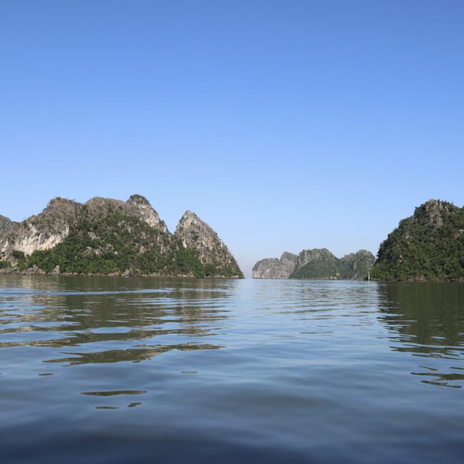 La baie de Lan Ha est souvent décrite comme la petite sœur de la baie d’Halong, toutes deux situées dans le golfe du Tonkin. Les paysages sont tout aussi majestueux : des pains de sucre karstiques plongeant dans l’eau turquoise, des grottes, et des plages sauvages.