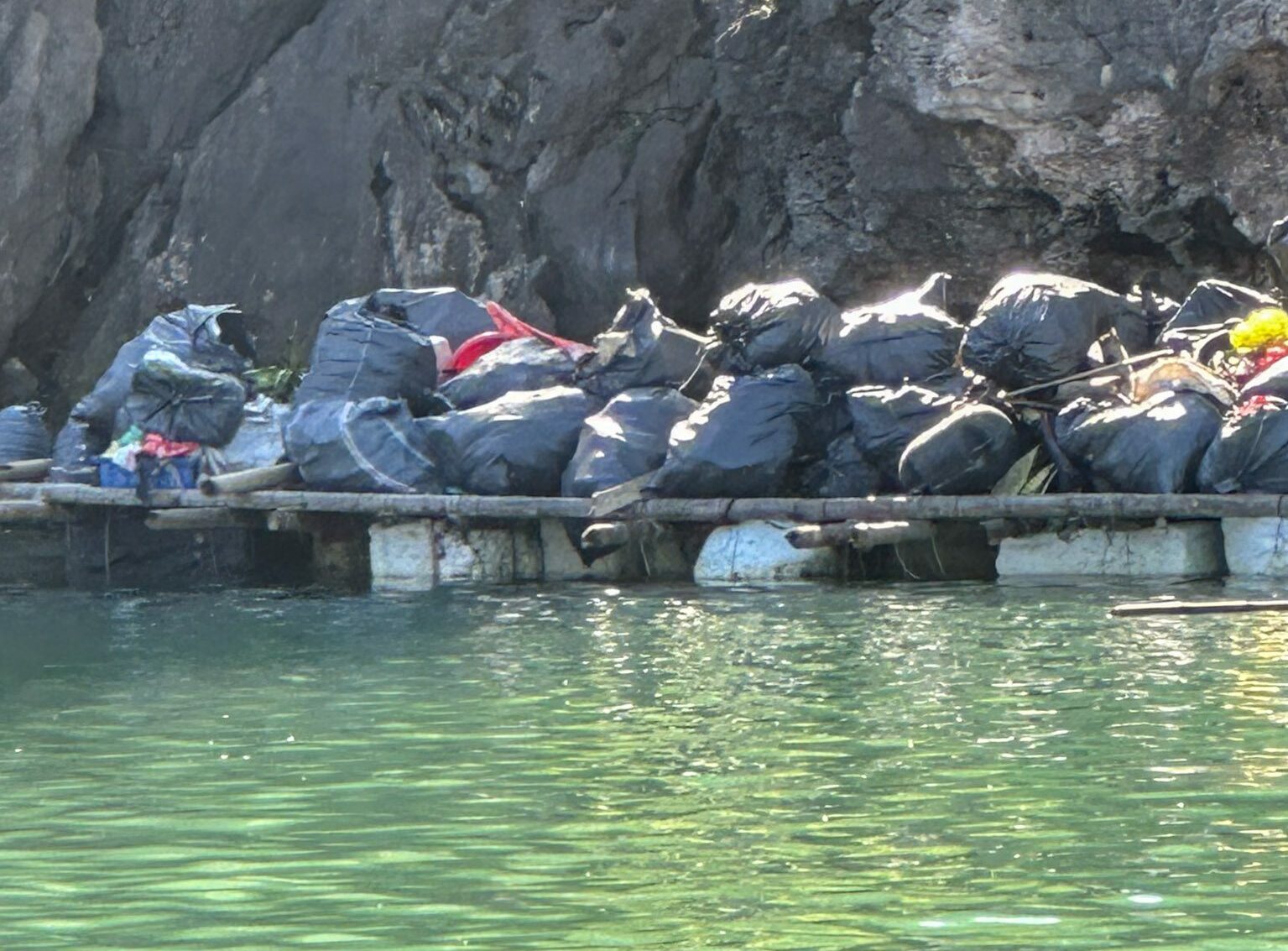 Pendant la balade en petit bateau, nous avons aperçu des déchets flottants par endroits, preuve que le problème de gestion des ordures reste présent malgré les discours des compagnies.