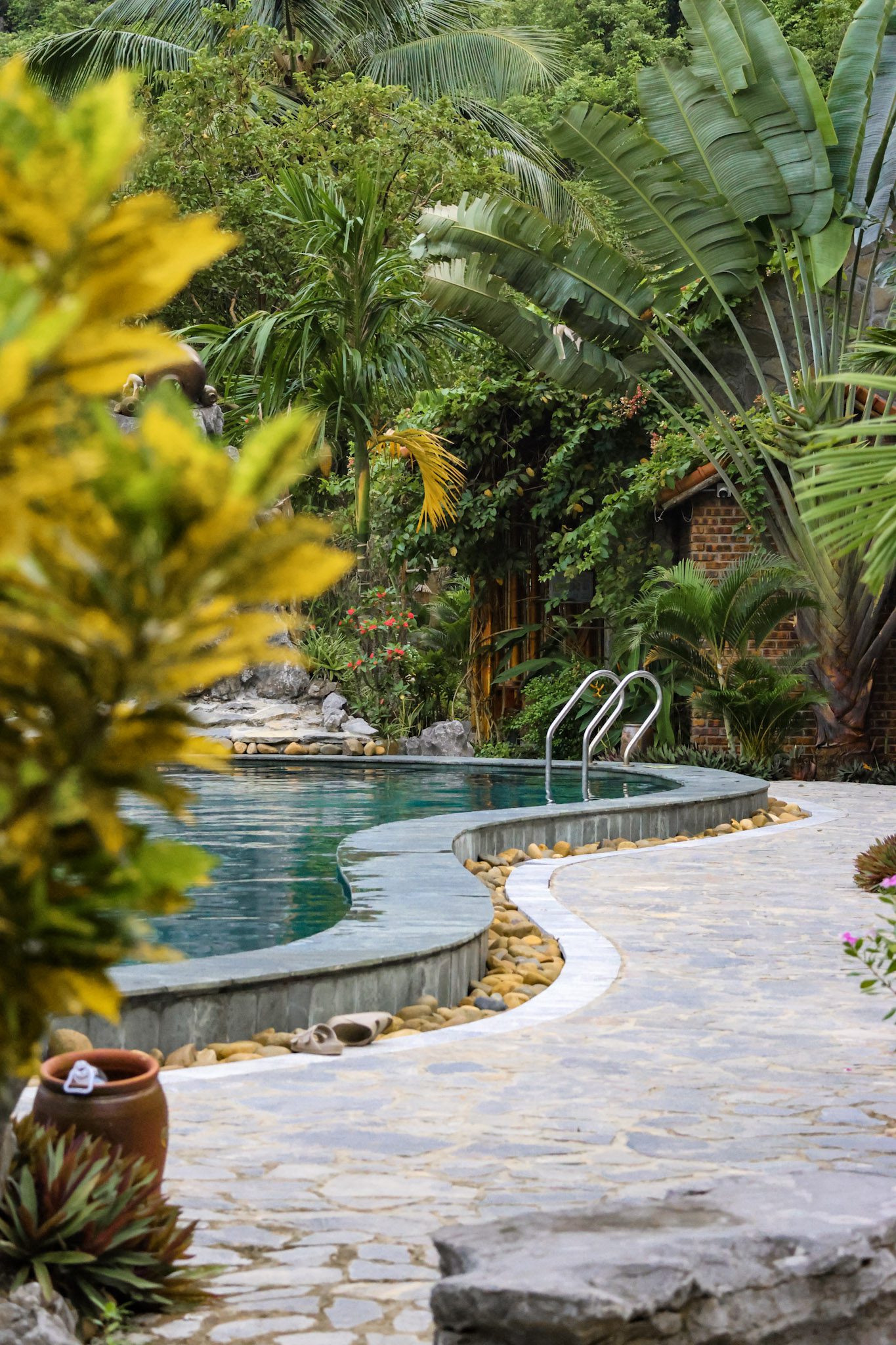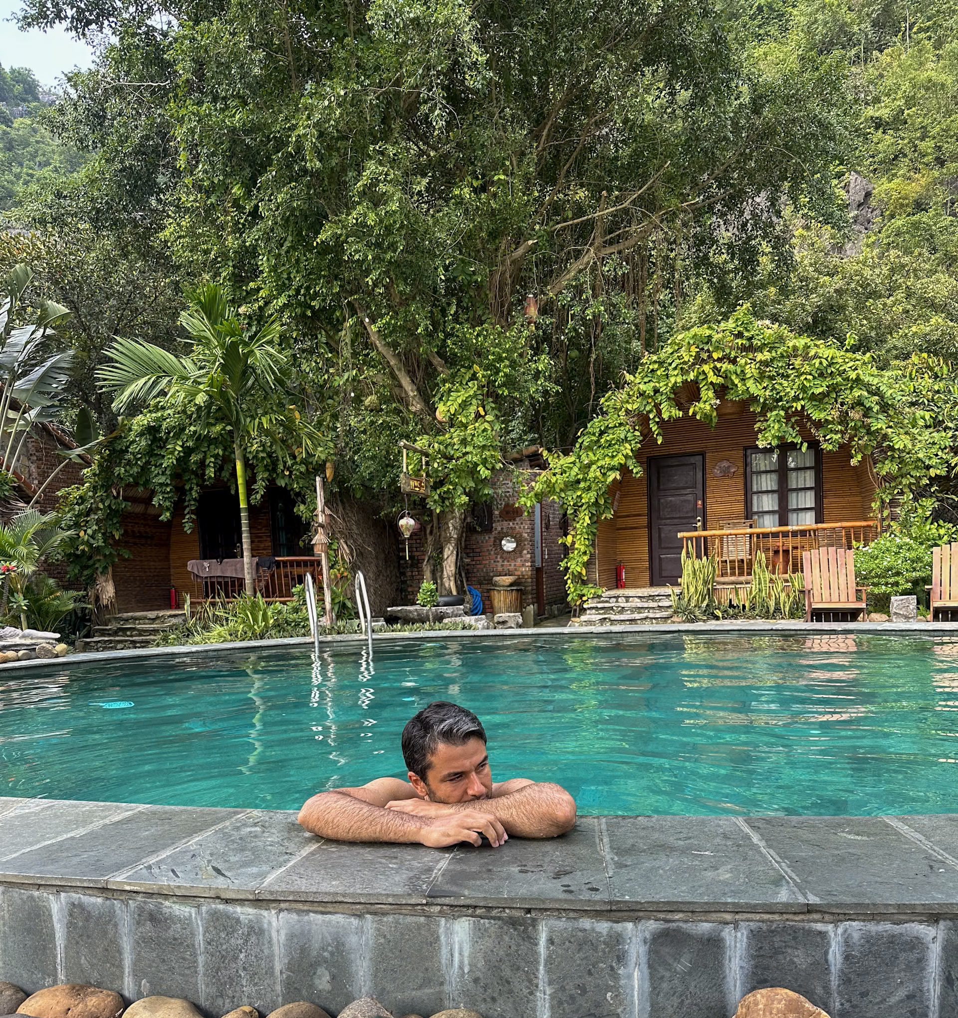 Nous avons séjourné dans le plus bel hôtel de tout notre voyage au Vietnam, véritable havre de paix en pleine campagne. Situé à une quinzaine de minutes en voiture du centre de Ninh Binh, l’établissement est niché entre montagnes karstiques et rizières, dans un calme absolu. Depuis la piscine, on profite d’une vue spectaculaire sur les reliefs environnants, sans aucun immeuble à l’horizon. Une sensation rare d’isolement total, comme si le temps s’était arrêté.